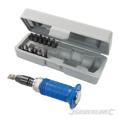 Destornillador de impacto con función reversible (sentido horario y antihorario). Mango engomado con protector para las manos. Atornillador con vástago cuadrado de ½” para utilizar con llaves de vaso. Incluye 13 puntas de acero S2: Phillips Nº 1, Nº 2, Nº 3, Nº 4, plana 5, 6, 8, 10 y 12 mm, hexagonal 4, 5, 6 y 8 mm. Acabado satinado. Incluye estuche de almacenaje.